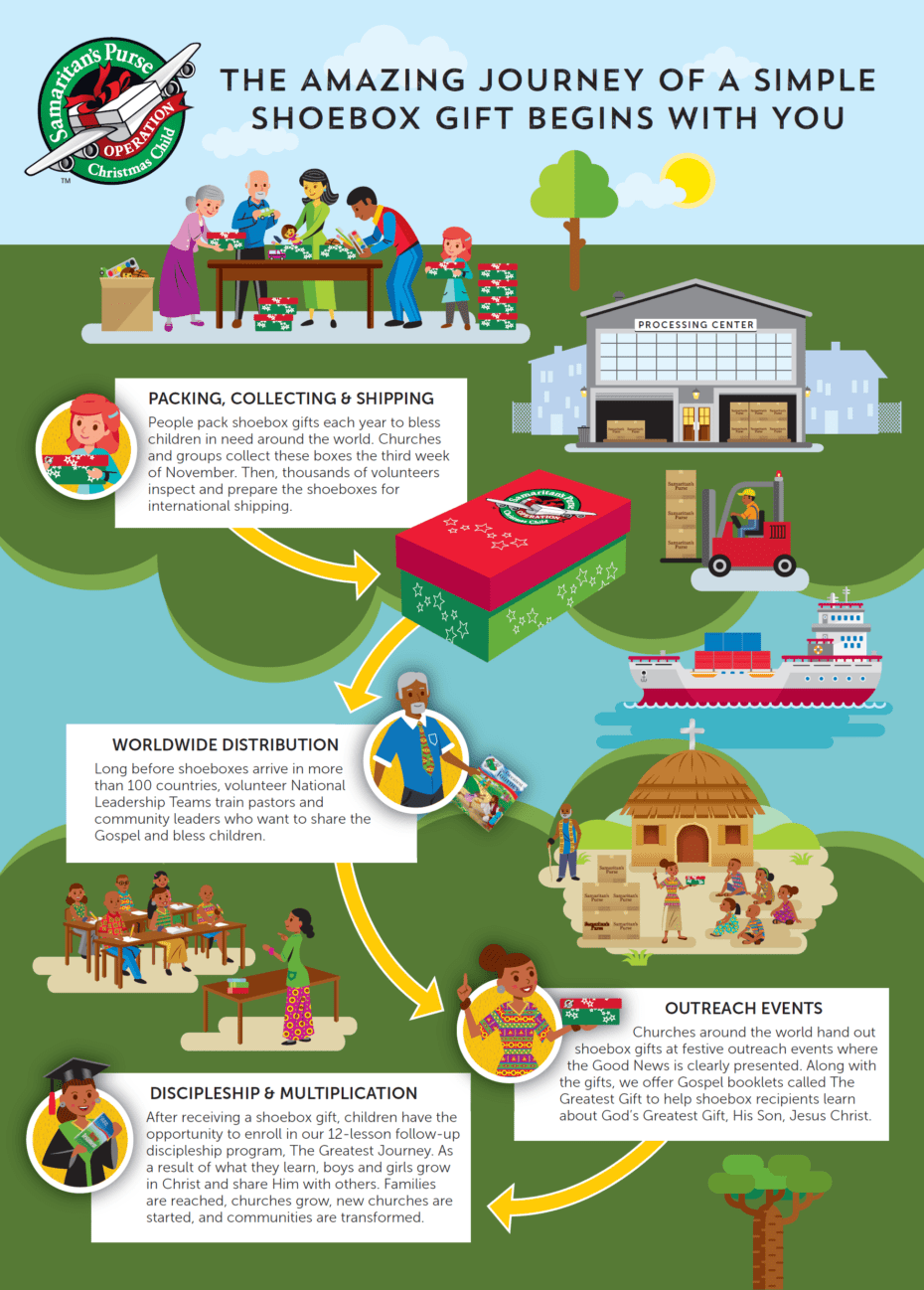 In 2016 over 8 million boxes were filled in the United States and delivered to children in 104 countries. At its heart, Operation Christmas Child is about the impact of a single gift delivered with the Good News of Jesus Christ into the hands of a boy or girl living in the midst of poverty and despair. Thanks to the warm hearts and helping hands, millions of children have the opportunity to experience the joy of Christmas.